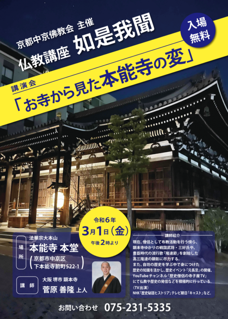 「お寺から見た本能寺の変」 Yamada_Shuji 2年前 日時:2024年3月1日 金本山講・13∶30〜講演・14:00~ 60分場所:本能寺本堂入場無料講演主催 京都中京佛教会〒604-8091 京都府京都市中京区寺町通御池下る 講師:大阪 堺市 顕本寺 菅原善隆氏