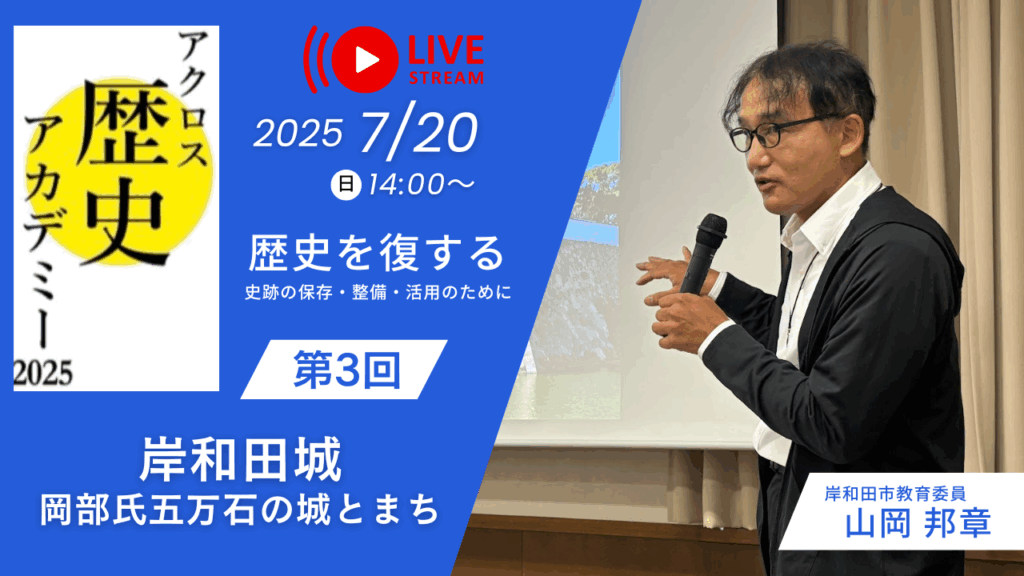 7/20(日) 第3回 岸和田城一岡部氏五万石の城とまちー 山岡 邦章さん(岸和田市教育委員会) 江戸時代の大阪府域における大規模な城郭は、大坂城、高槻城そして岸和田城の三つです。岸和田城の天守閣に昭和に再建され、その前に造られた八陣の庭は国の名勝に指定されています。さらに城下町にも多くの歴史遺産と風情ある街並みが残っています。江戸時代から近年に至る岸和田の歩みを語っていただきます。そして史跡を街づくりにどのように生かすのか考えます。